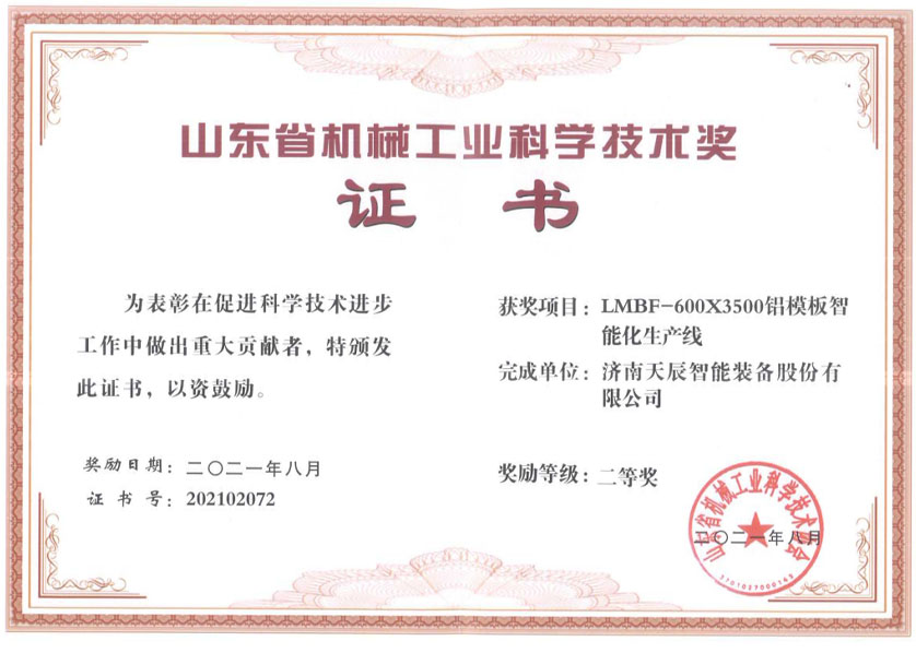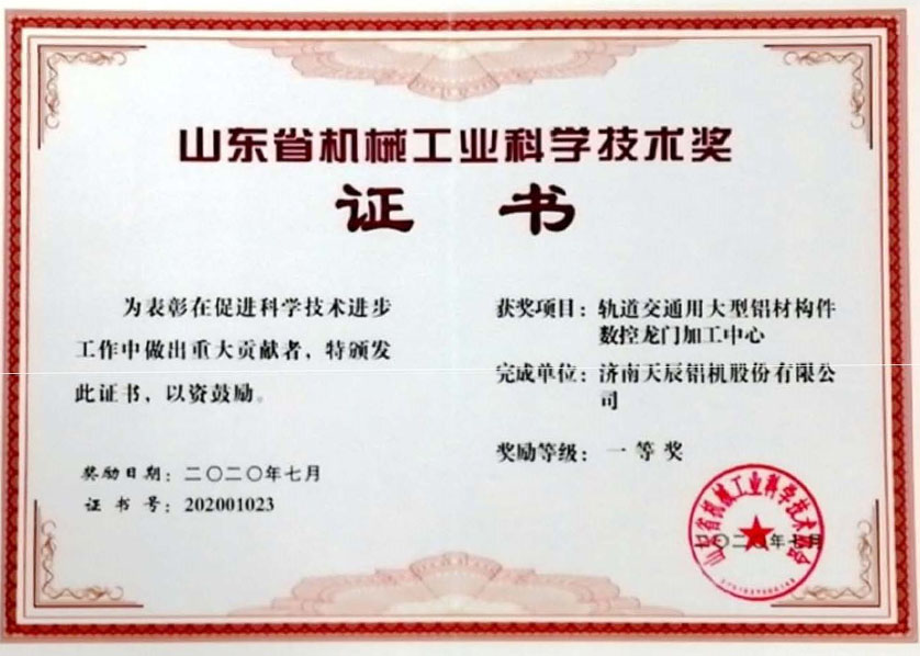 2020年山東省機械工業(yè)科學技術獎一等獎