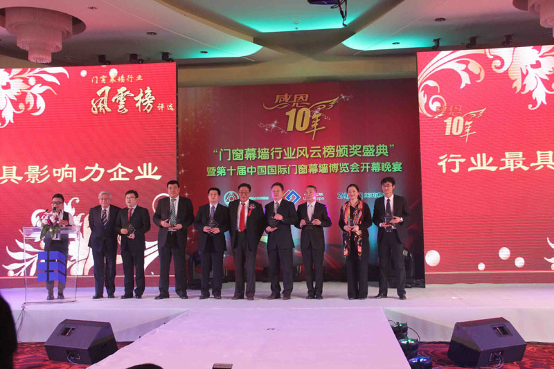 2012年11月23日,由中國建筑金屬結(jié)構(gòu)協(xié)會主辦的“感恩十年——門窗幕墻行業(yè)風云榜評選”頒獎盛典在北京舉行。經(jīng)過2個月的激烈角逐,我公司以絕對優(yōu)勢高居加工設備類榜首,榮獲一呼百應大獎——最具影響力企業(yè)獎。
