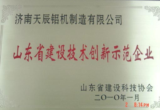 ??? 2010年2月26日山東省住房和城鄉(xiāng)建設(shè)廳在濟(jì)南南郊賓館召開(kāi)全省建設(shè)科技工作會(huì)議,隆重表彰了全省建設(shè)科教工作和墻材革新建筑節(jié)能工作先進(jìn)集體、先進(jìn)個(gè)人,省建設(shè)技術(shù)創(chuàng)新獎(jiǎng)評(píng)獎(jiǎng)結(jié)果和省建設(shè)技術(shù)創(chuàng)新示范企業(yè)、建筑節(jié)能優(yōu)秀示范工程名單。天辰鋁機(jī)公司獲省建設(shè)技術(shù)創(chuàng)新示范企業(yè)。